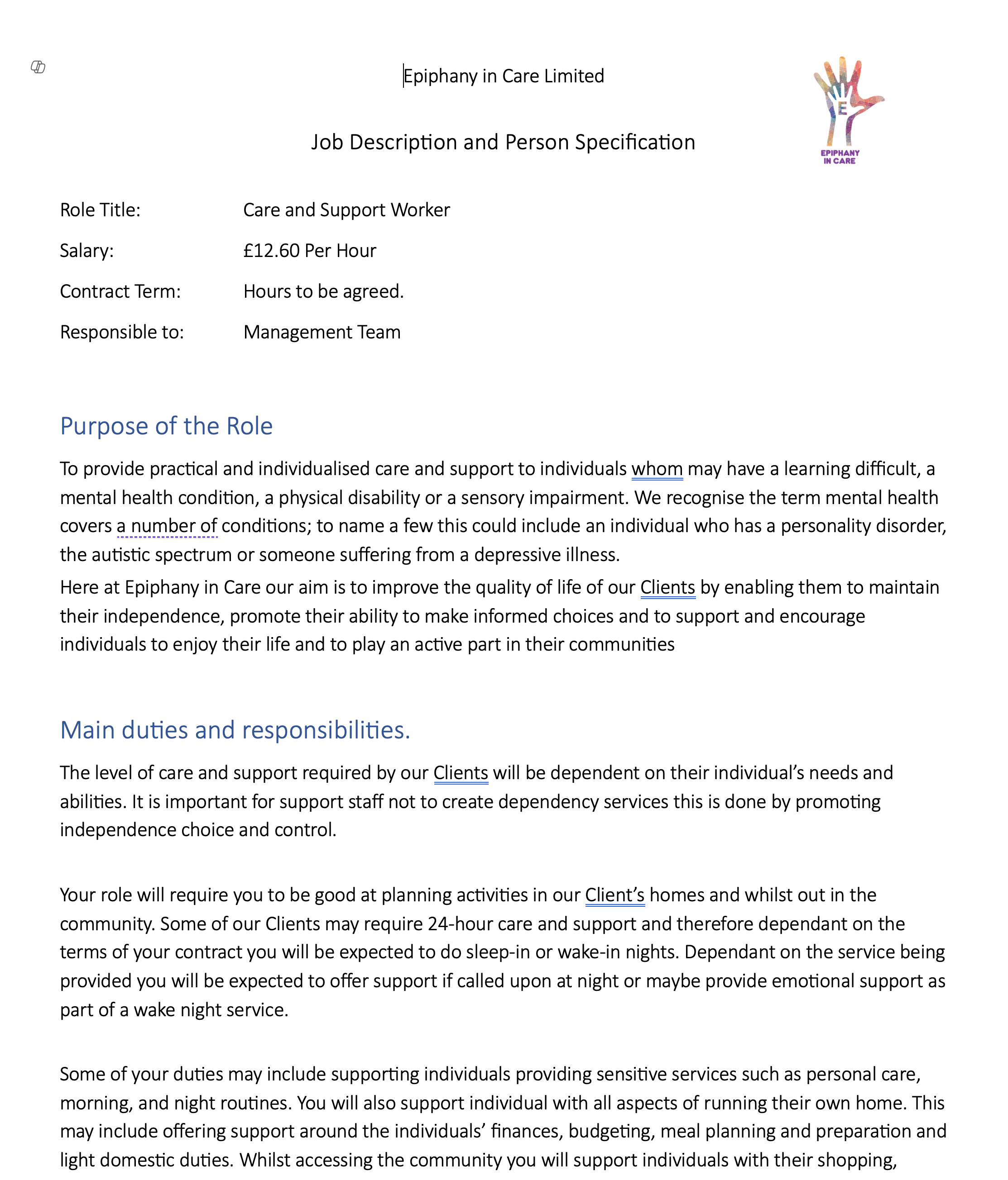 Care and Support Worker, Application Pack. Application Form Job Description Equal Opportunities Policy Equal Opportunities & Diversity